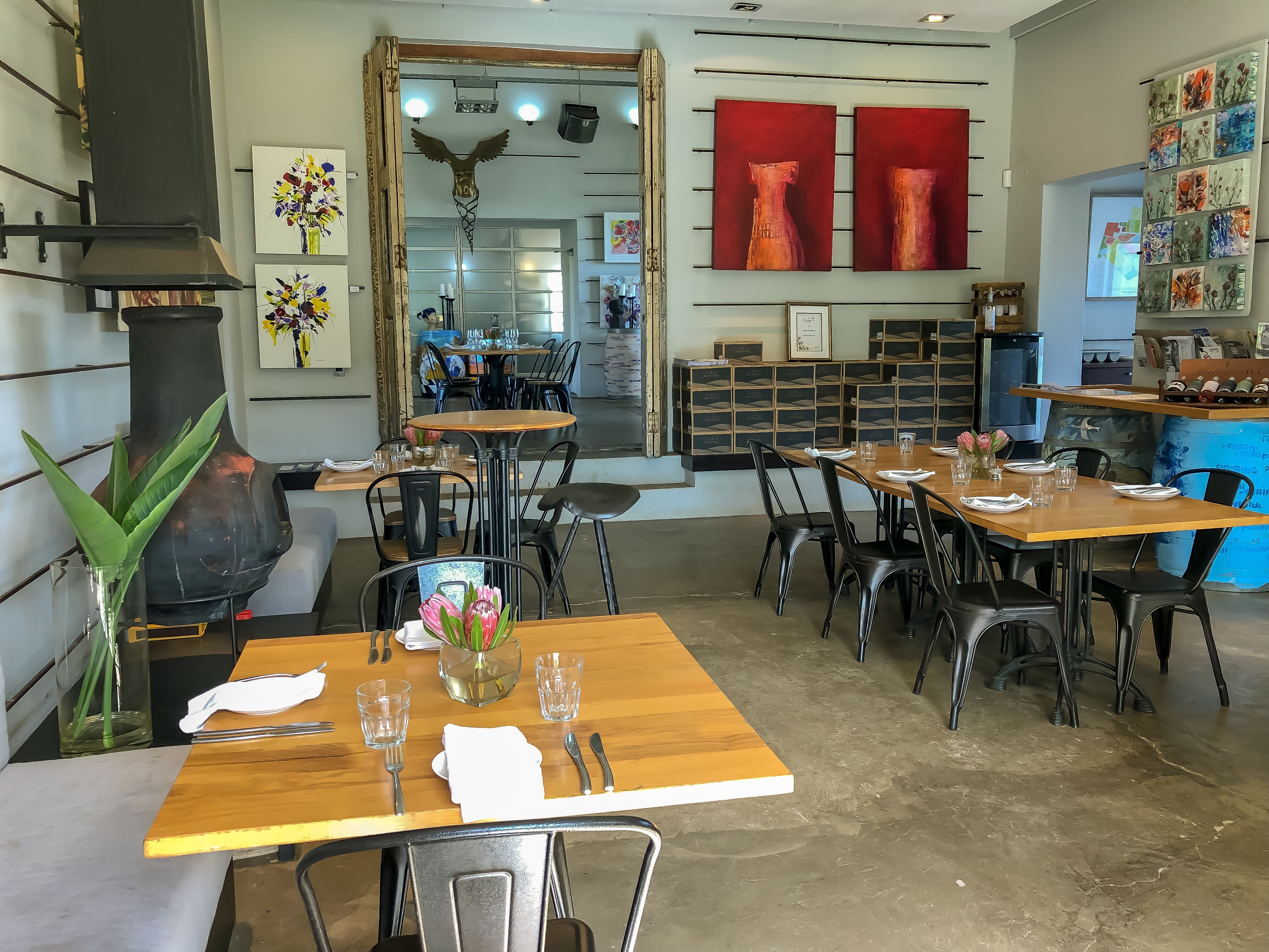 The Gallery Restaurant with its modern furnishings is set in an art gallery and houses a variety of artworks that include paintings, small and large scale sculptures, photography, ceramics and mixed medium works, as well as selected conceptual work, and has excellent views from its veranda and the lawned terraces.