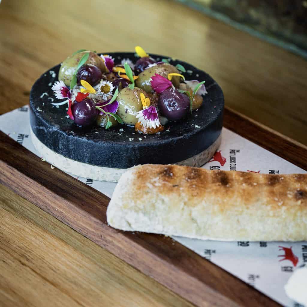 - Ciabatta, Smoked Butter, Marinated Olives.