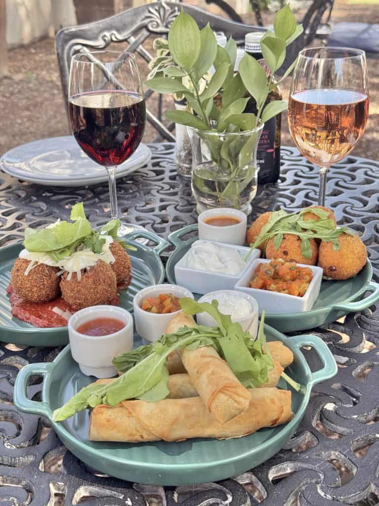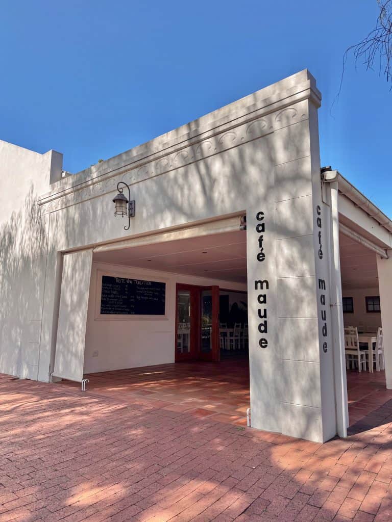 Café Maude offers both indoor and outdoor seating, but the outdoor space? That’s where the magic happens! You’ll be treated to stunning views of the estate while relaxing in a serene atmosphere. Their menu is a treat for the senses. From mouthwatering breakfast dishes to light meals, salads and flatbreads and if you’ve got a sweet tooth, I highly recommend grabbing a slice of their cake paired with a steaming cup of coffee. We indulged in some delightful Bobotie cigars, crispy Arancini balls and cheesy, melt-in-your-mouth cheese balls, all perfectly complemented by a glass of Bon Courage’s wine.